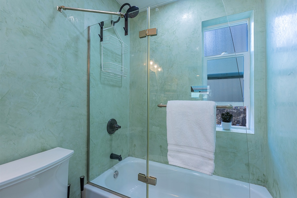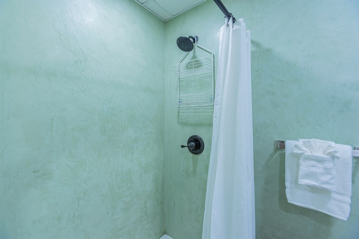-Primary Bedroom: Queen bed, AC, ceiling fan, en suite bathroom with walk-in shower